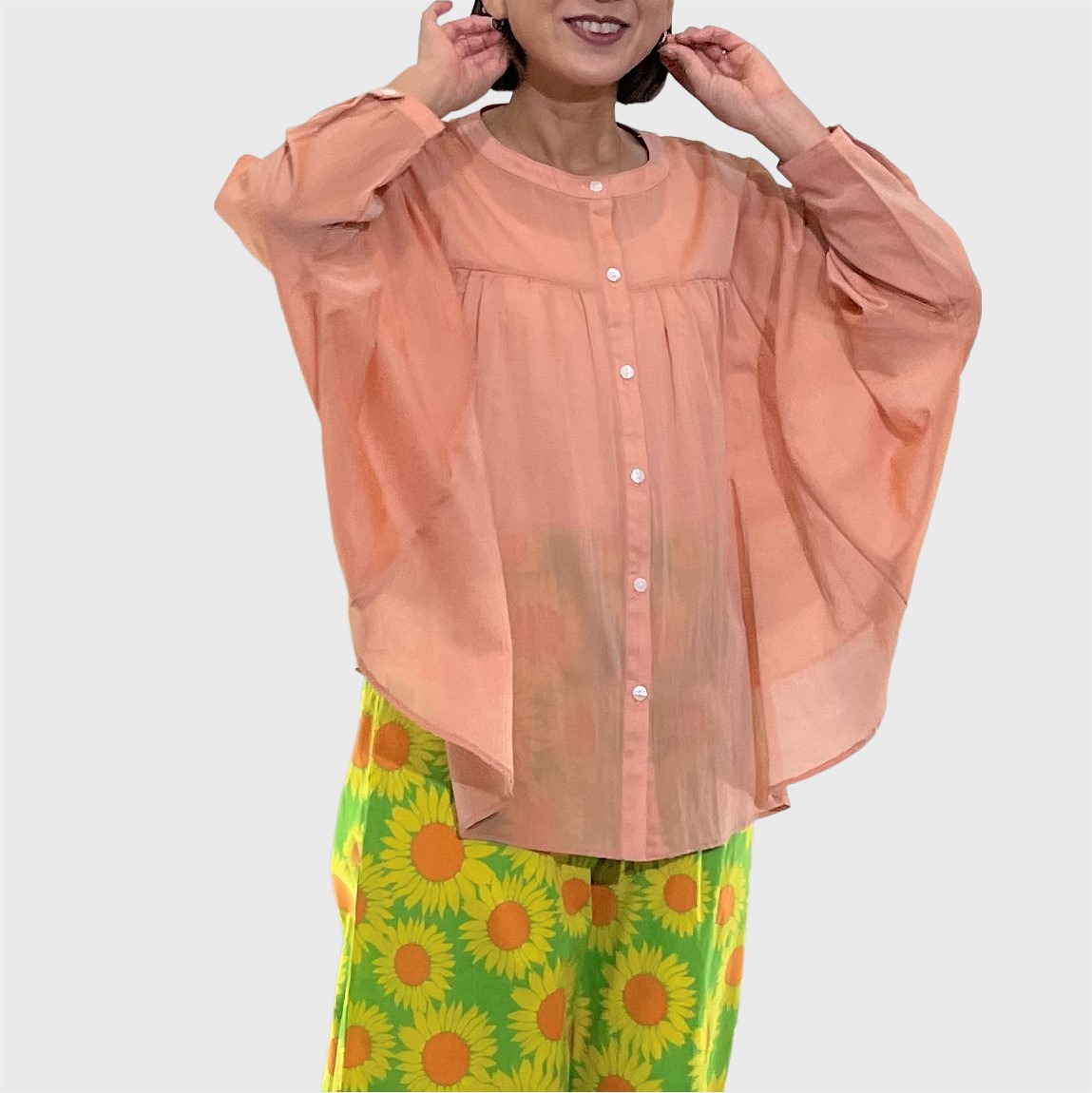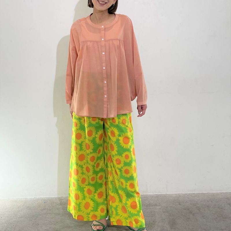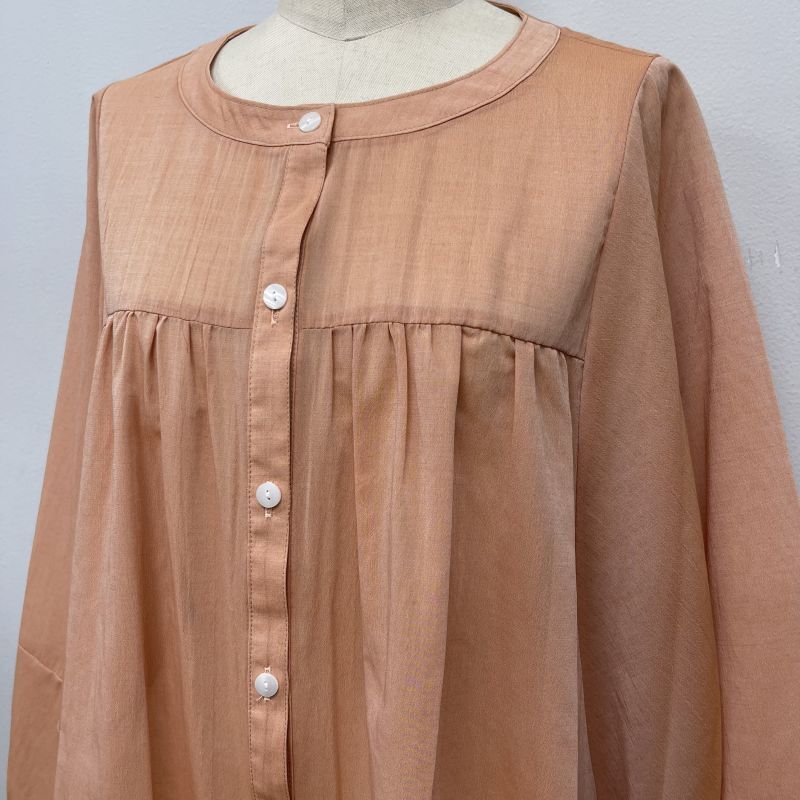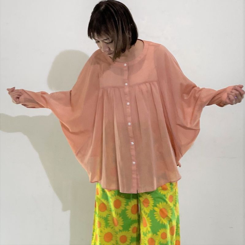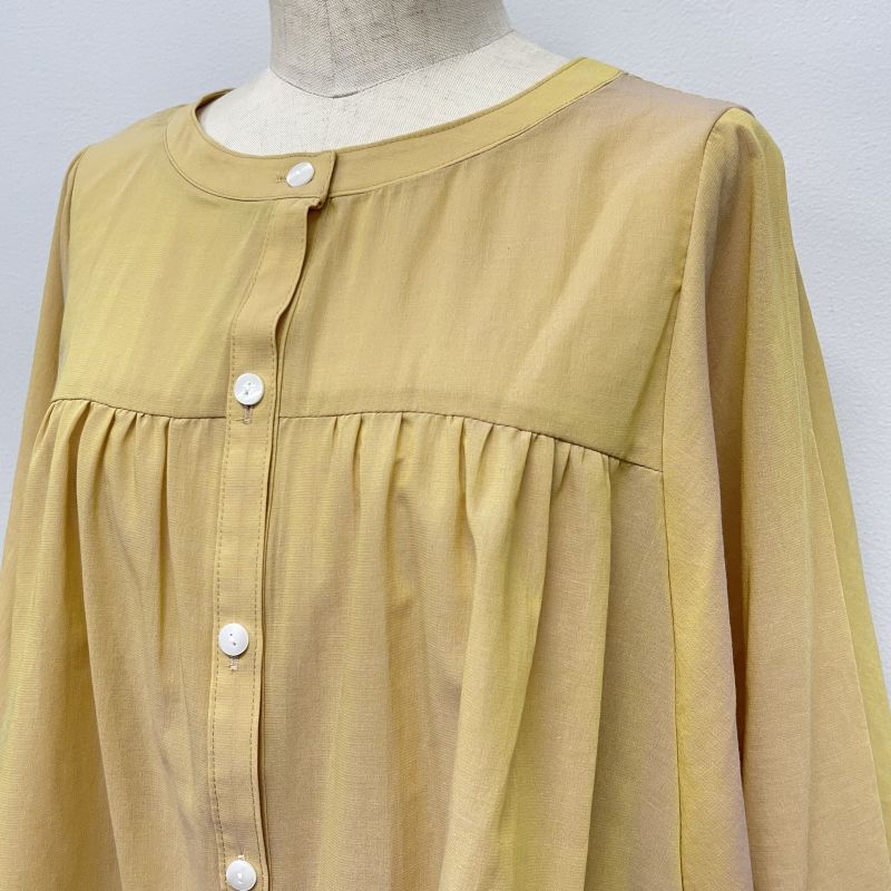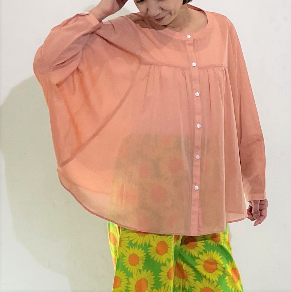 素材は綿/ポリエステルのシフォン。薄手で透け感があり、サラッとしたドライな肌触りです。裾がラウンドしたオーバル型のシルエットでラフにゆったりと着て頂けます。中でもイエローは縦糸と横糸の色が違うため玉虫色のシャンブレーになっており見る方向から色が違います。