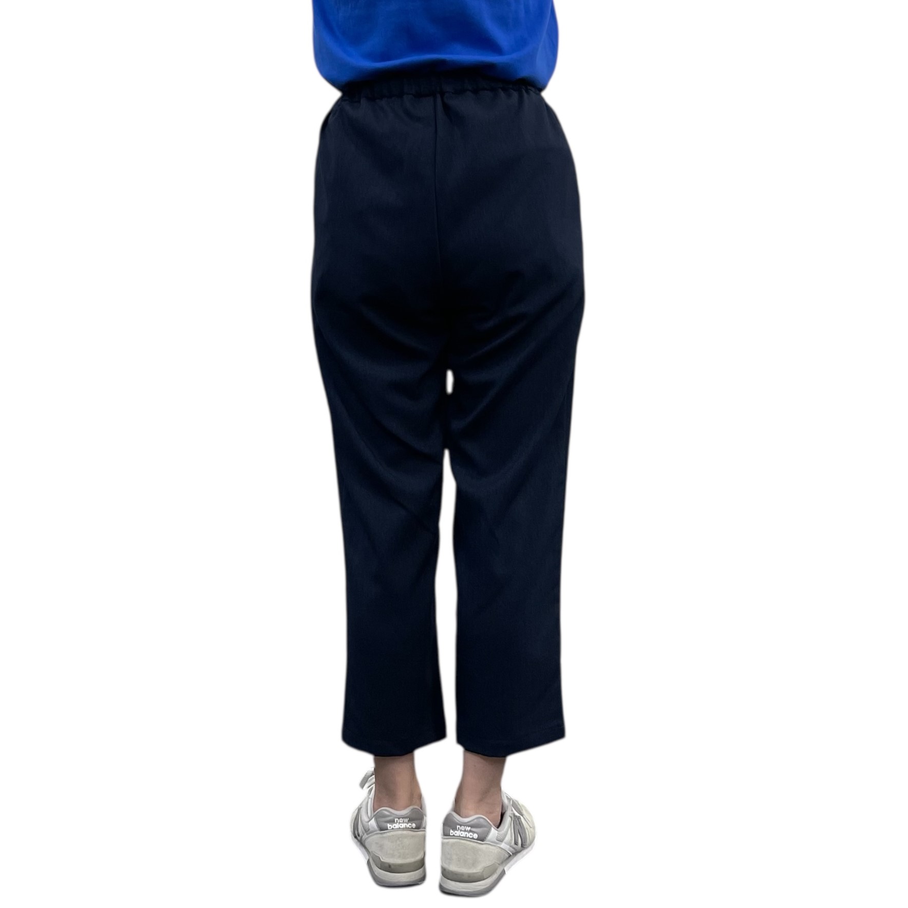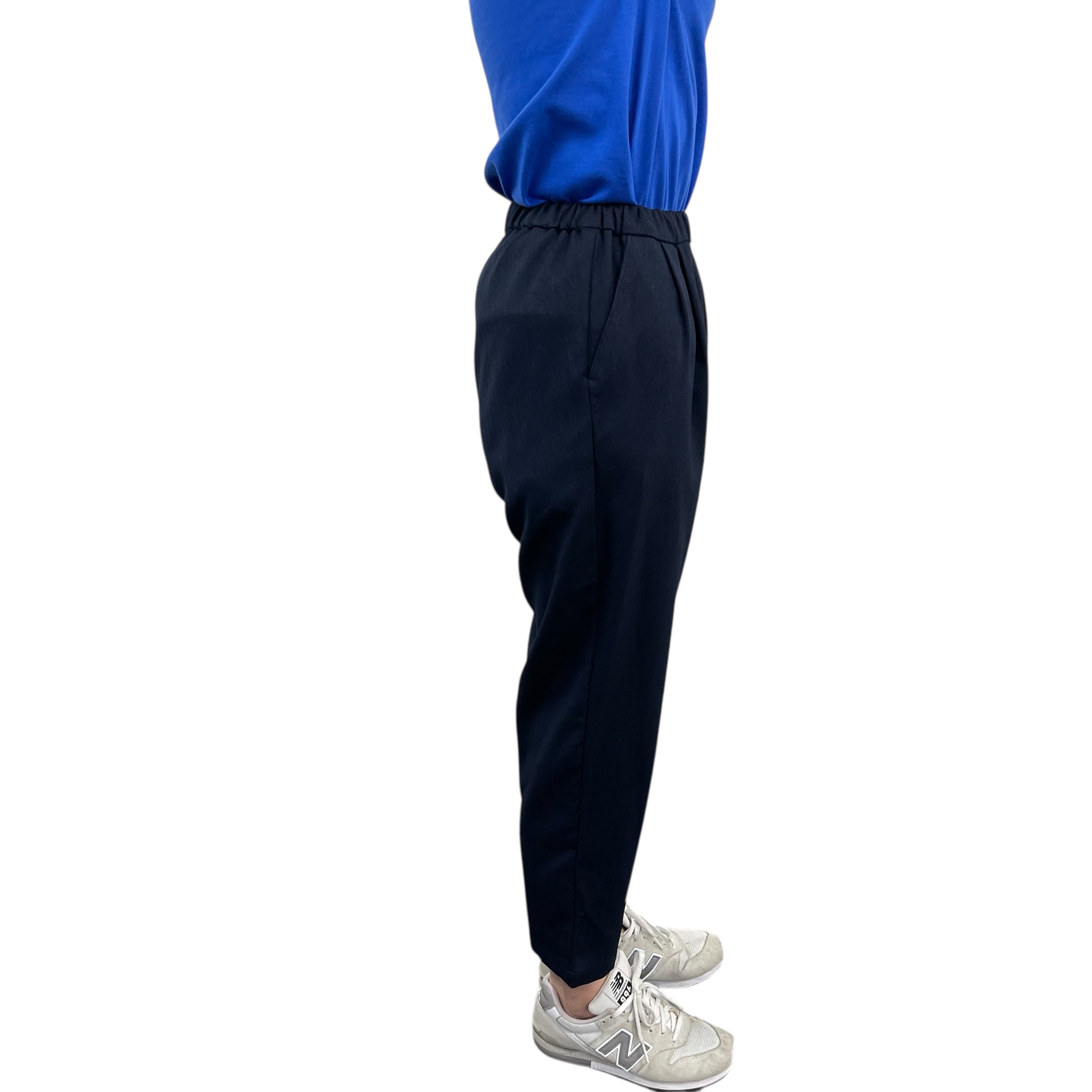シルエットは裾が細め、お腹周りとヒップはゆったりめです。後ろ股上が長く腰を覆います。お腹周りにもタックを入れてゆったりとさせて、ウエストゴムは柔らかくしめつけ感のない特殊なゴムを使用しました。内側に綾テープを通してあるので、縛ってサイズ調整できます。生地は軽くてウールライクなヘリンボーン柄が有り、柔らかくシワになりにくく、家庭洗濯ができるイージーケア素材です。