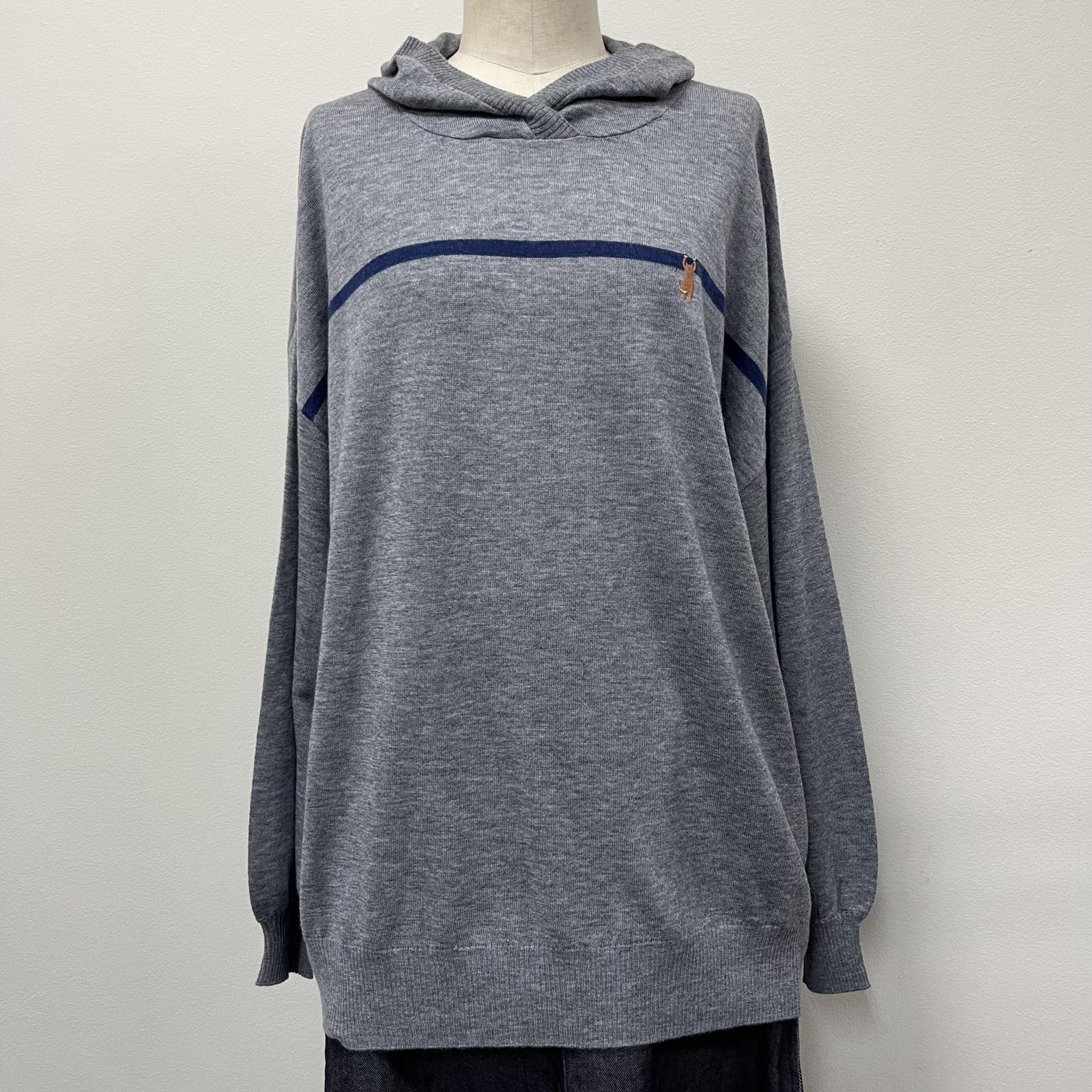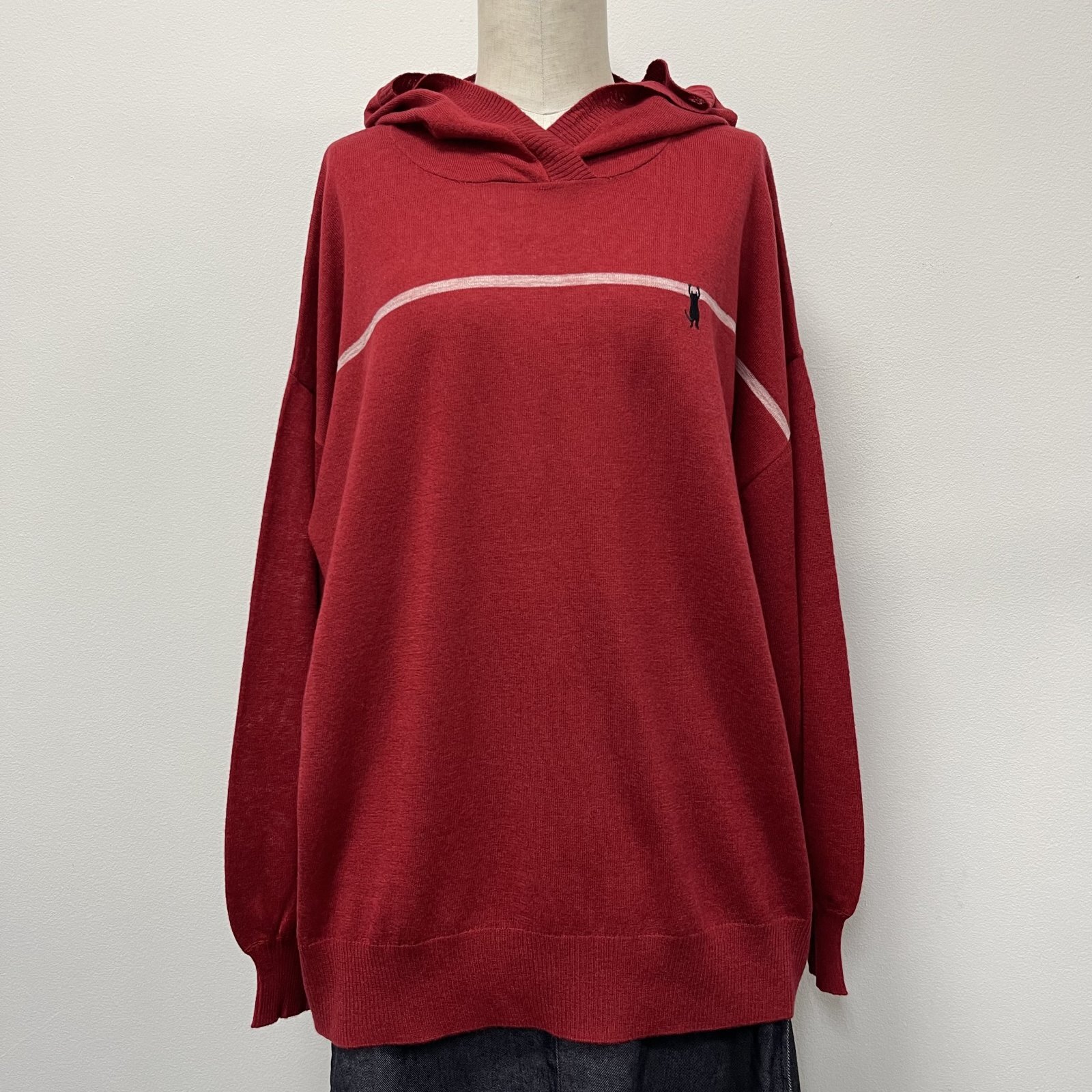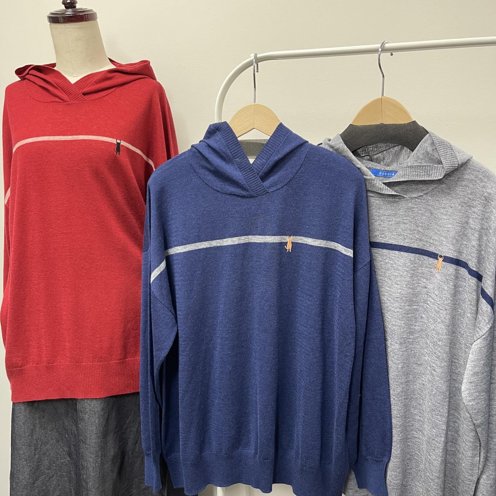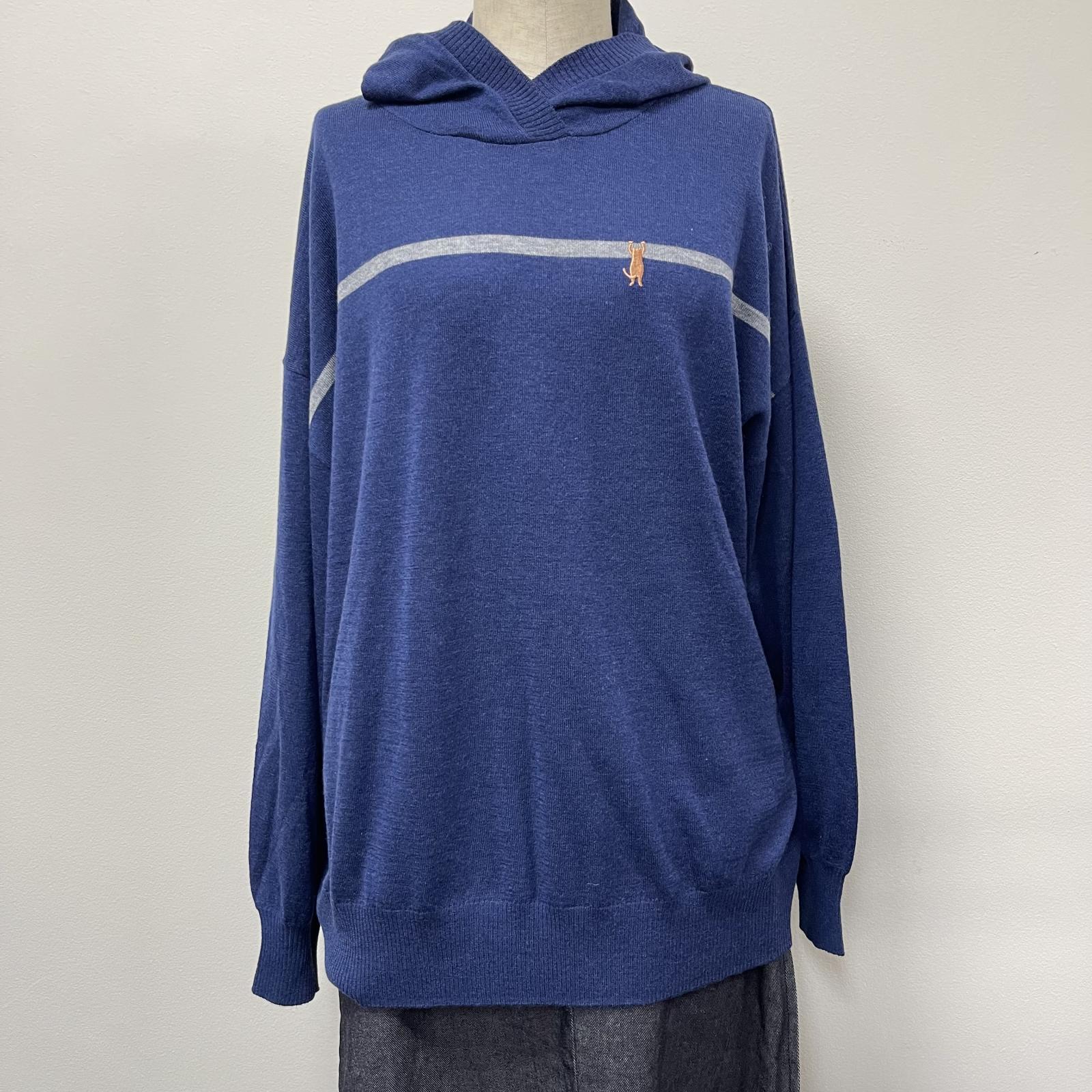 ニットのフードプルオーバー。素材は薄くツルッとした毛玉になりにくい糸を選びました。
