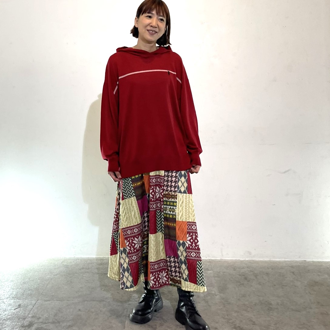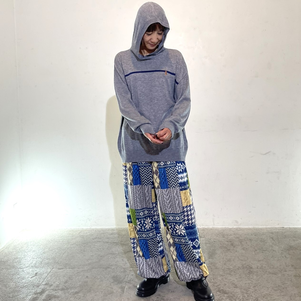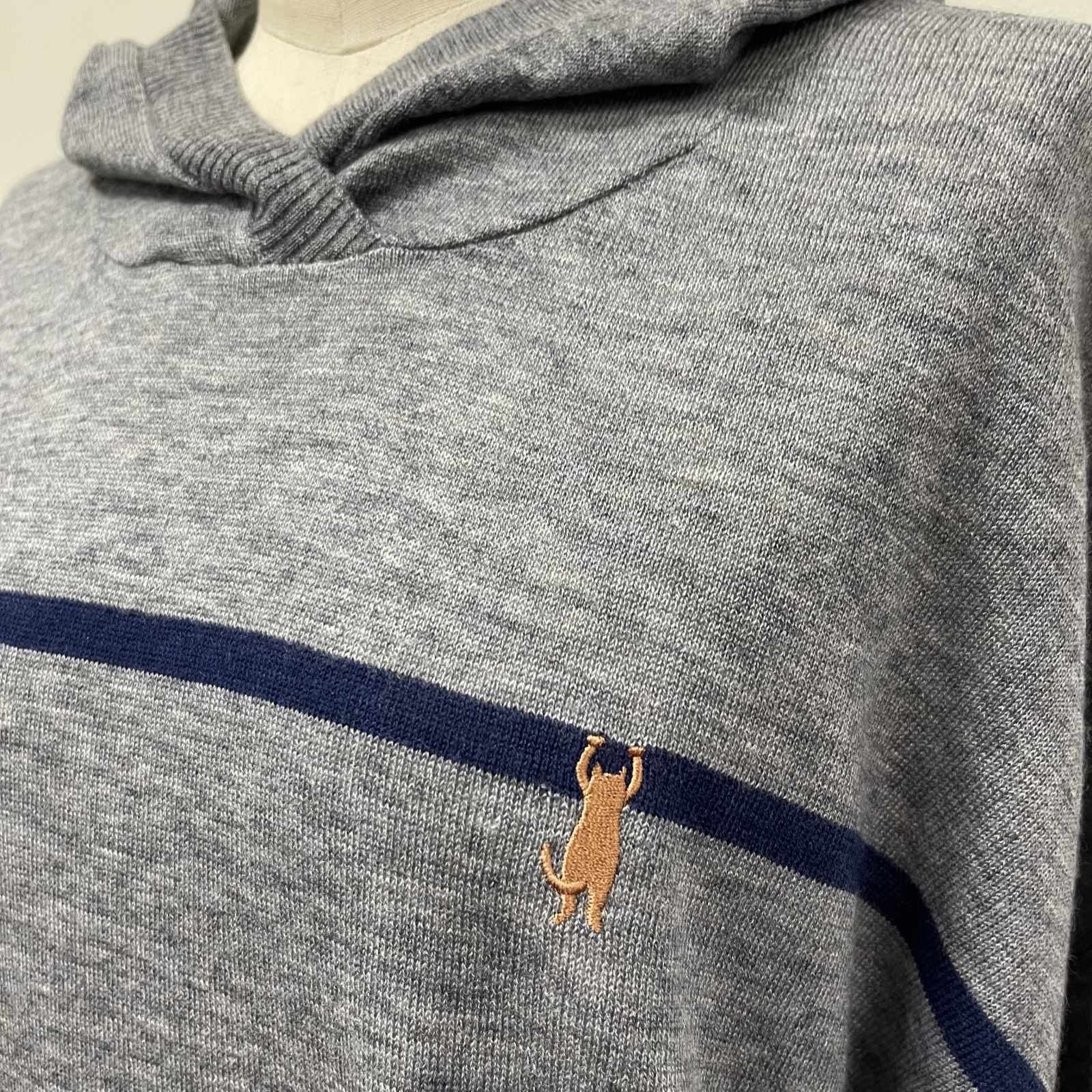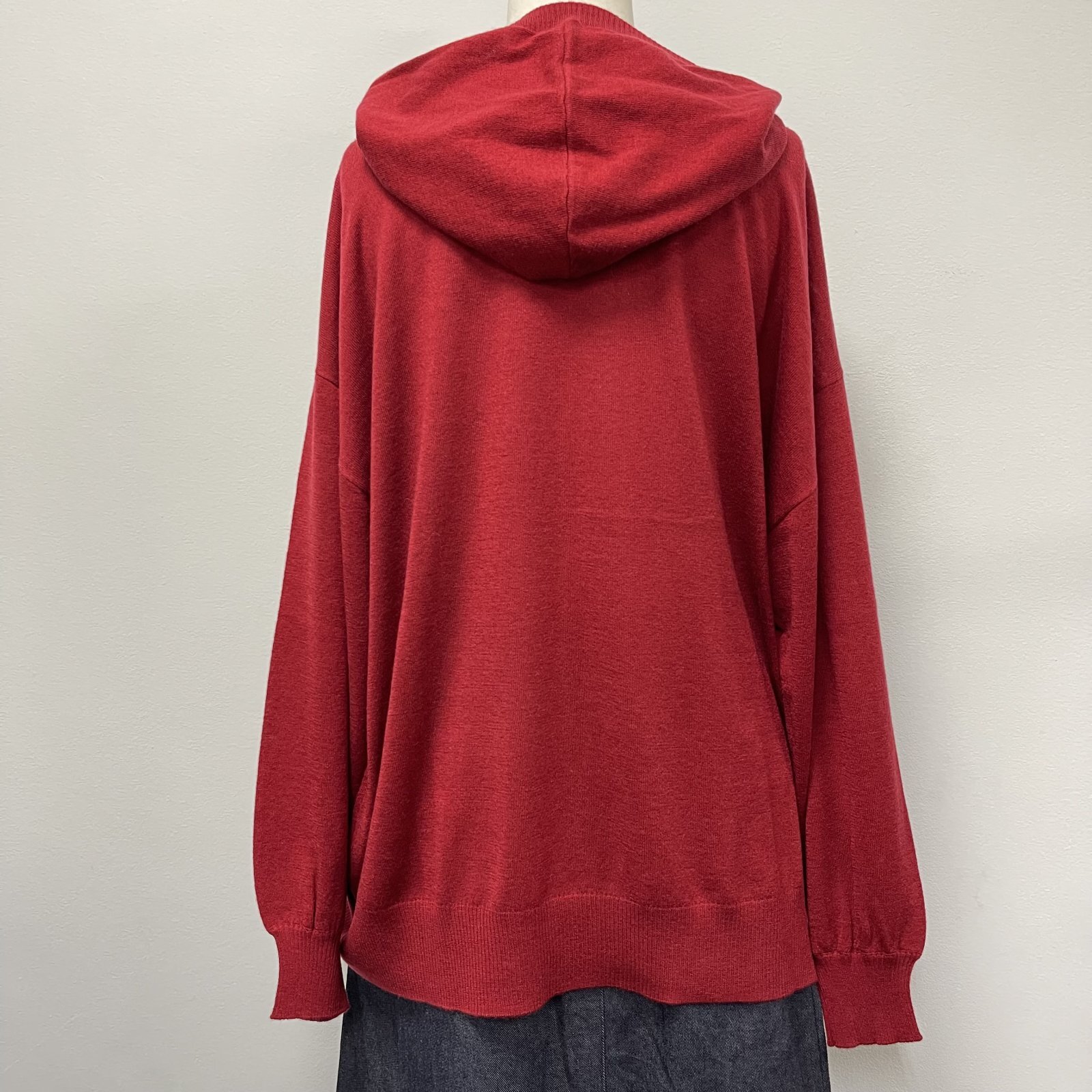 ニットのフードプルオーバー。素材は薄くツルッとした毛玉になりにくい糸を選びました。