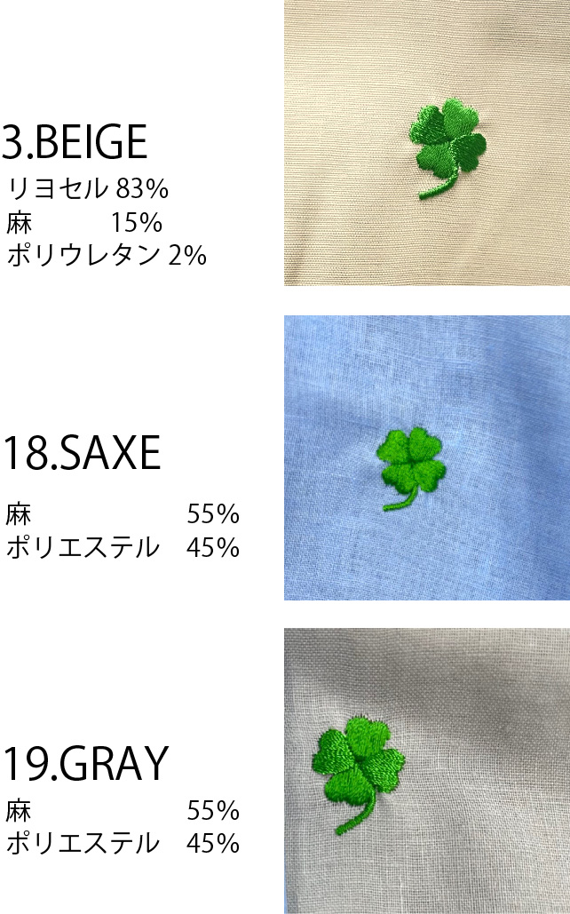| 素材 | BEIGE=リヨセル83% 麻15% ポリウレタン2% GRAY,SAXE=麻55% ポリエステル45% |