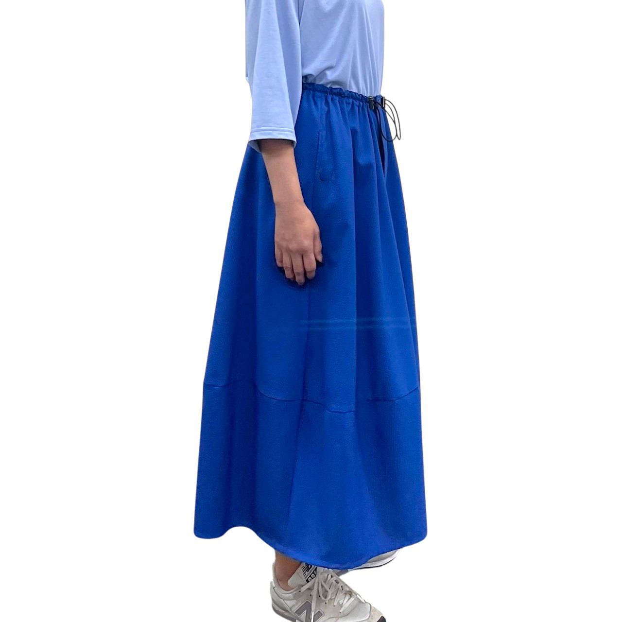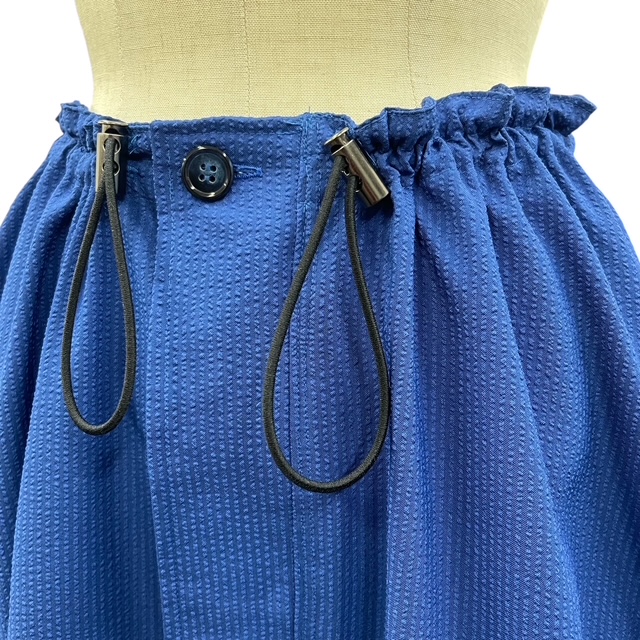 ウエストは丸ゴムとストッパーで自由に調節ができる。